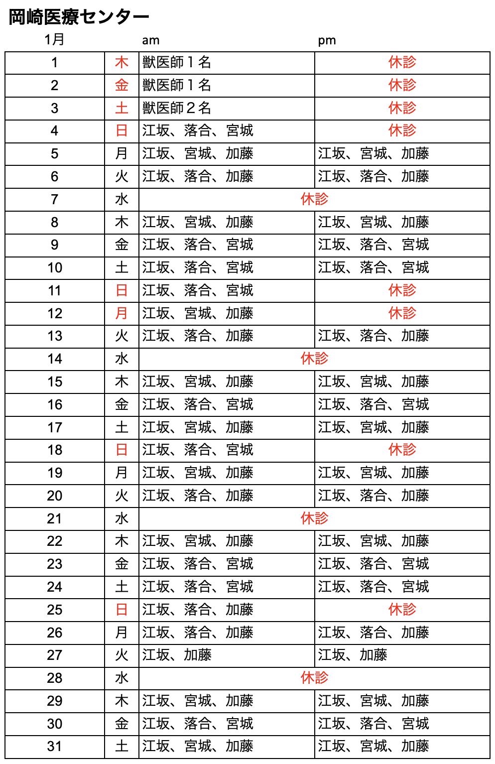 | 外科診療 | 去勢や避妊手術や、整形外科の診療や治療。 |